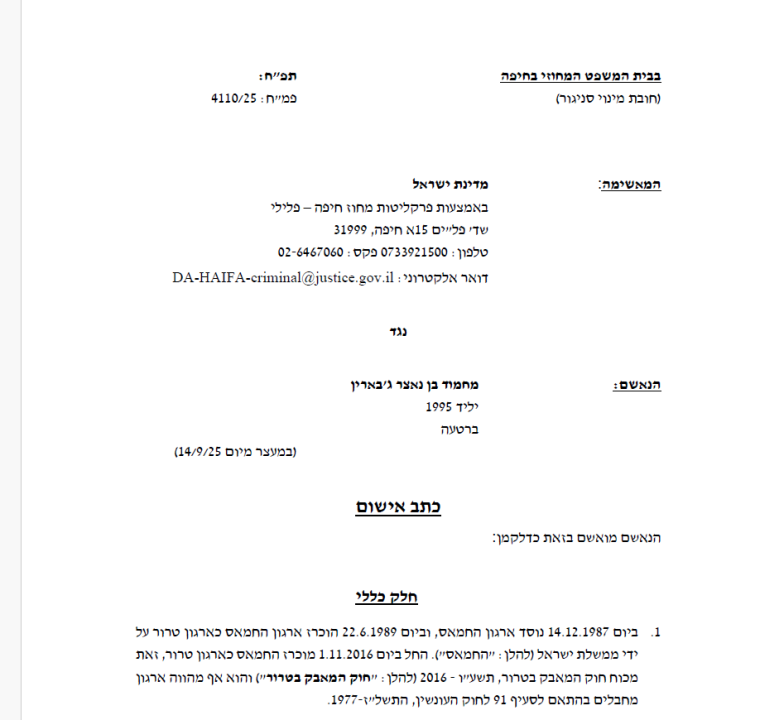 זה התחיל בהודעה תמימה לכאורה ברשת החברתית פייסבוק. מחמוד בן נאצר ג'בארין, בן 30 מברטעה, קיבל בשנת 2023 בקשת חברות ממישהו שהציג את עצמו בשם סלימאן אלנגאר, המכונה "אבו מלאכ". אבל זה לא היה סתם מישהו – סלימאן היה תושב רצועת עזה, ולטענת התביעה, פעיל בכיר בארגון החמאס. מחמוד, כך נטען בכתב האישום שהוגש ע"י פרקליטות מחוז חיפה, הבין את זהותו האמיתית של סלימאן, אך החליט להשיב לפנייה ולהיכנס לשיחה שתשנה את חייו לחלוטין. כעת הוא יושב במעצר מאז ה-14 בספטמבר, מואשם במגע עם סוכן חוץ, פעולה ברכוש טרור וגילוי הזדהות עם ארגון טרור.